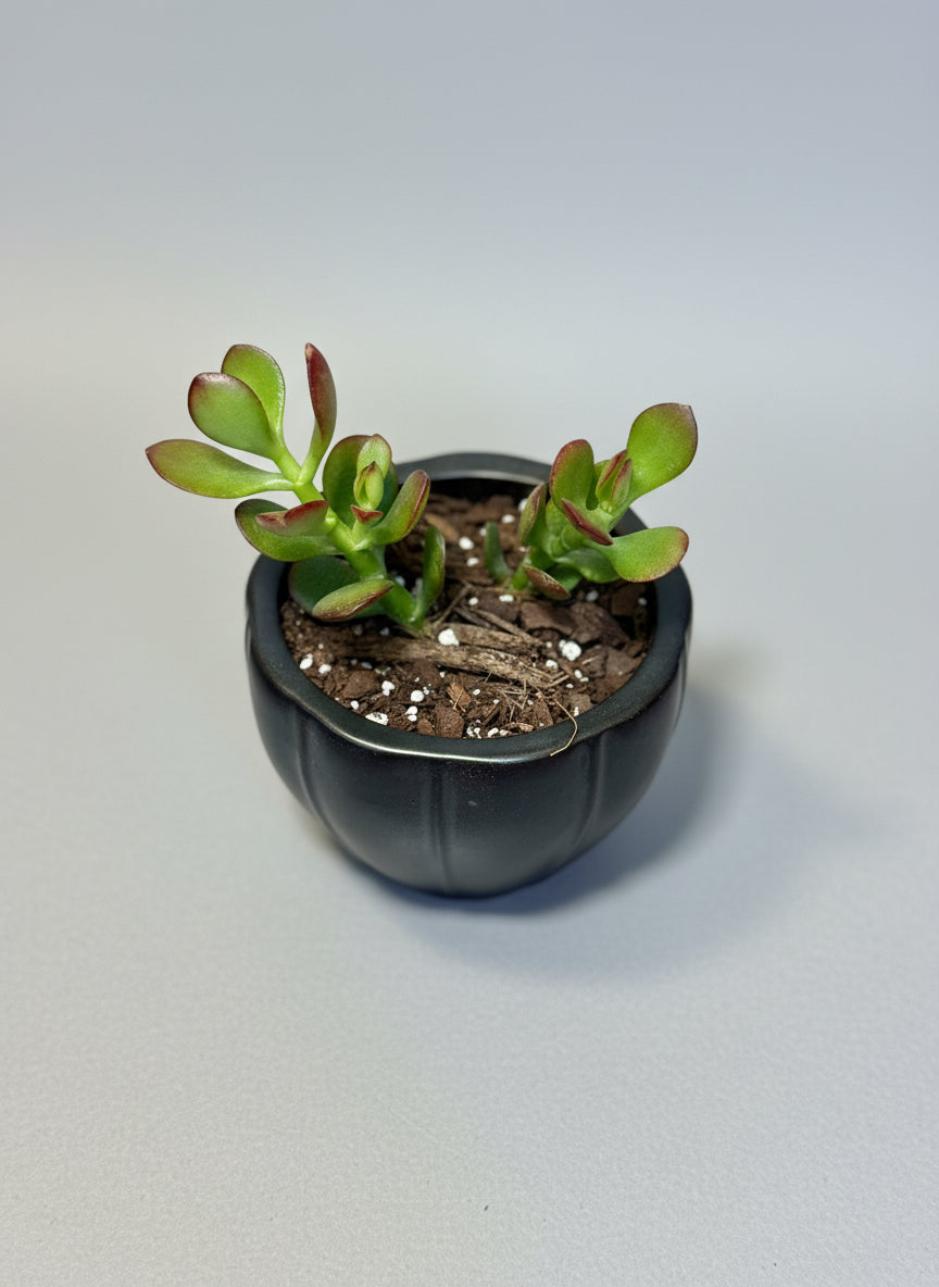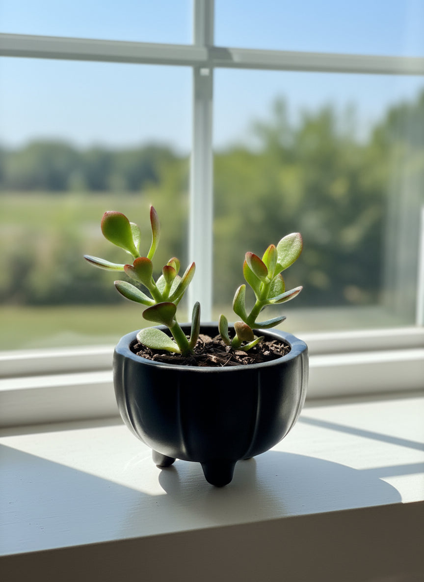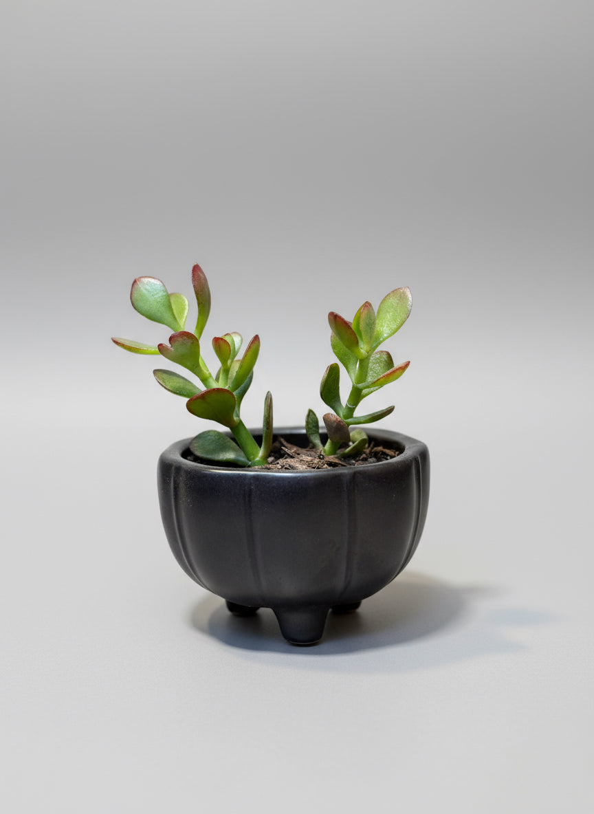Bring a touch of calm, grounded beauty to your space with this Baby Jade succulent — a symbol of resilience and prosperity. Its thick, glossy leaves with soft red edges pair perfectly with the modern charcoal footed pot, creating a balanced mix of natural charm and contemporary design.