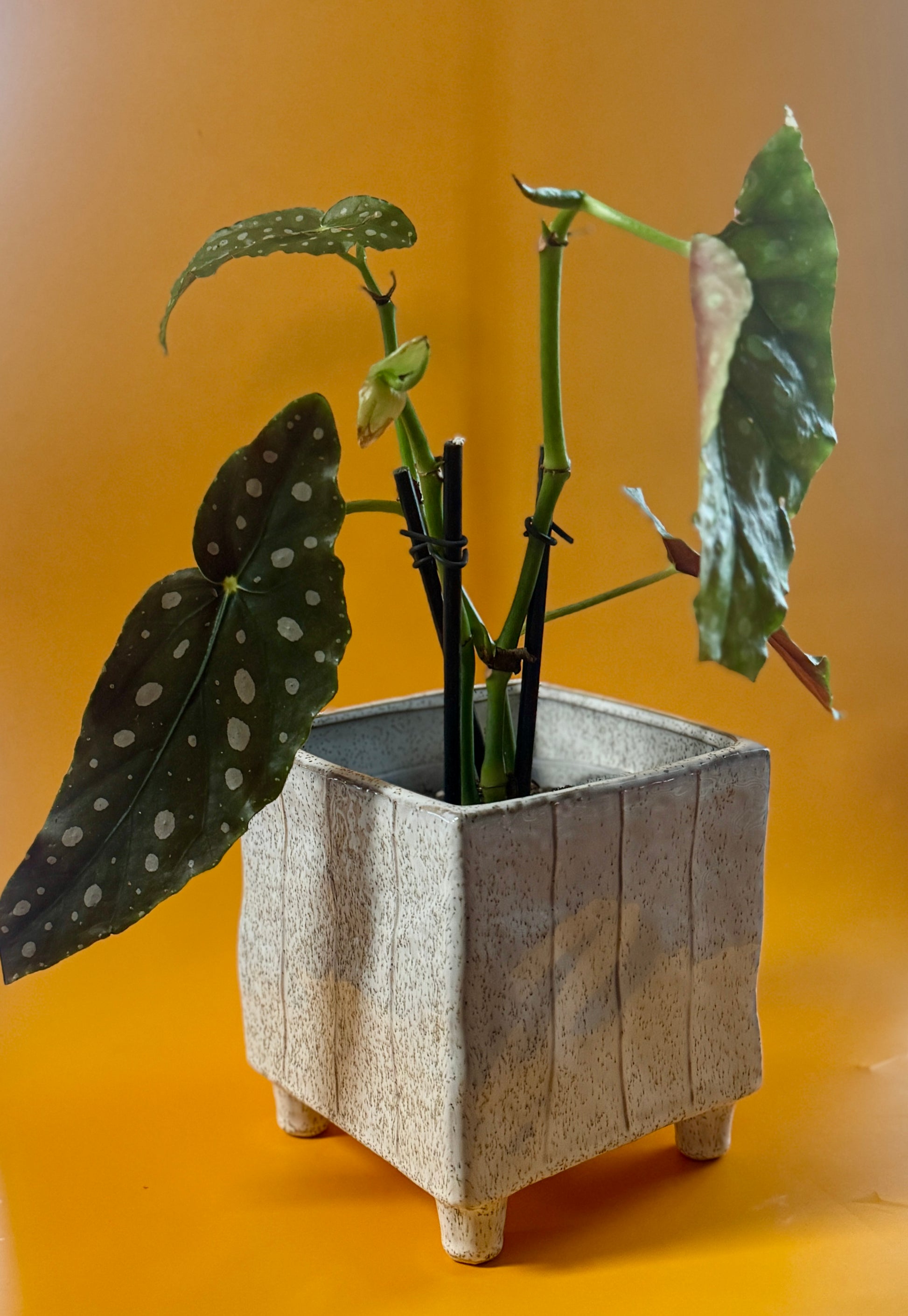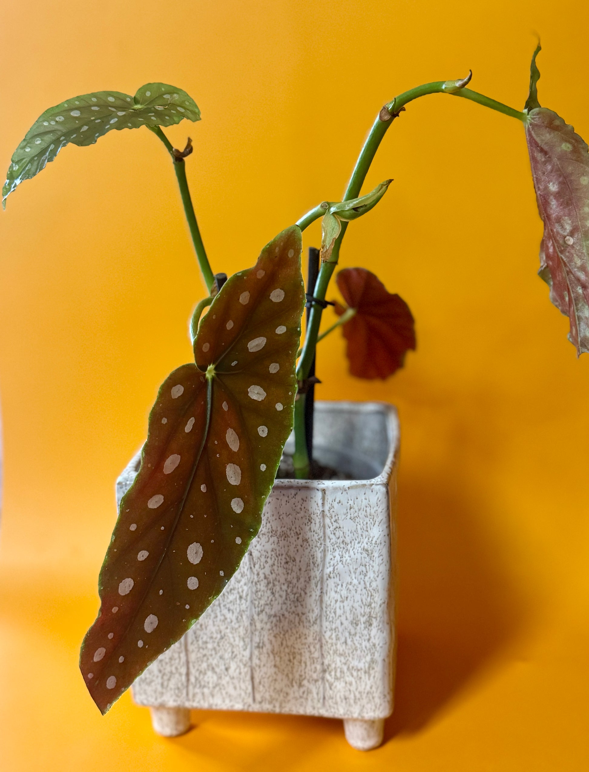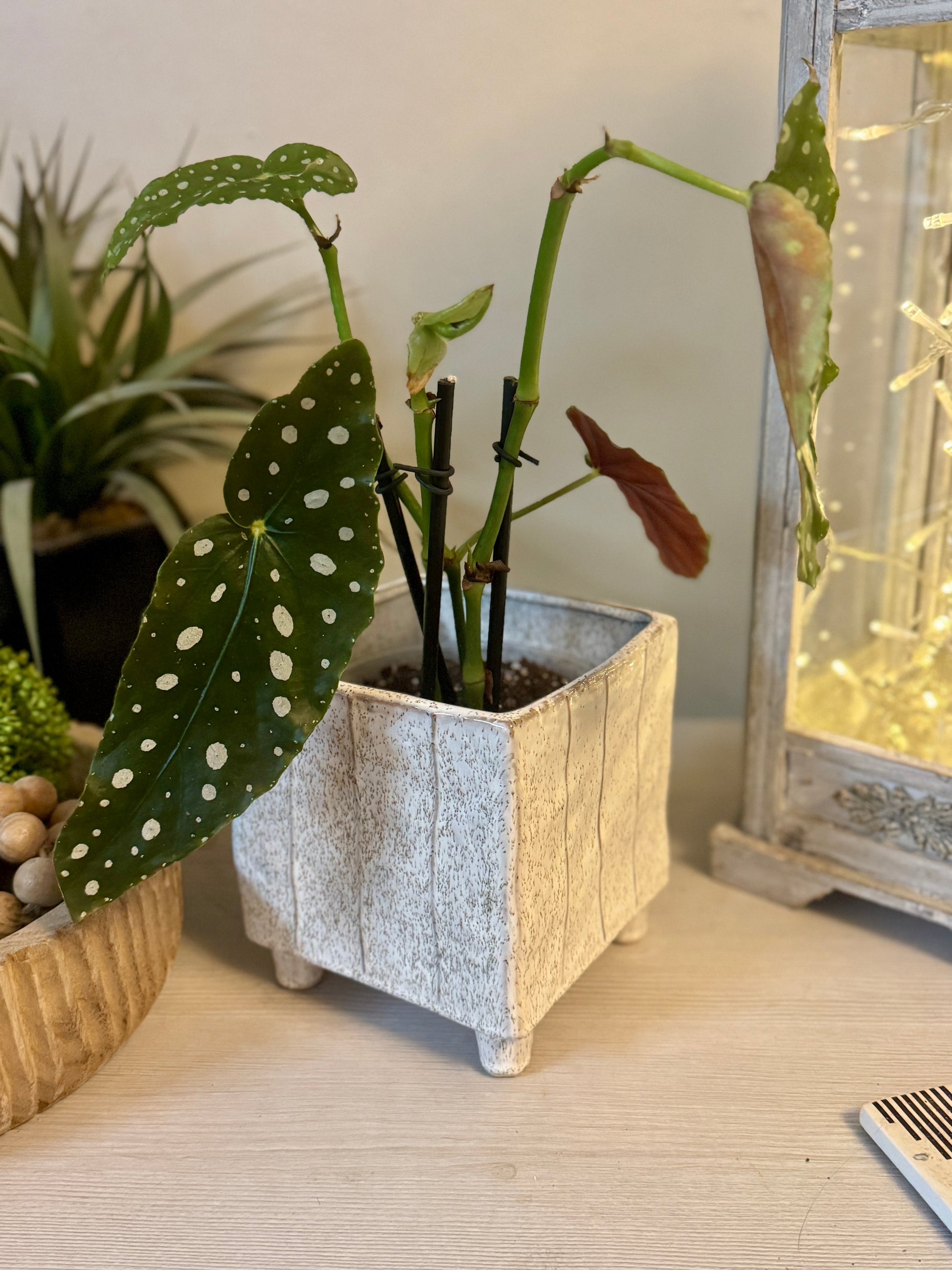 Add a pop of personality to your plant collection with this striking Polka Dot Begonia. Known for its whimsical green leaves splashed with white spots and deep red undersides, this plant is a total showstopper. It’s paired with a square footed planter.