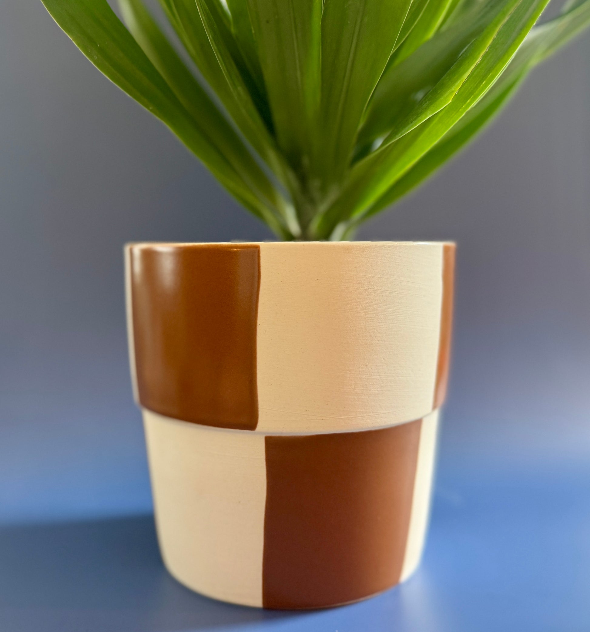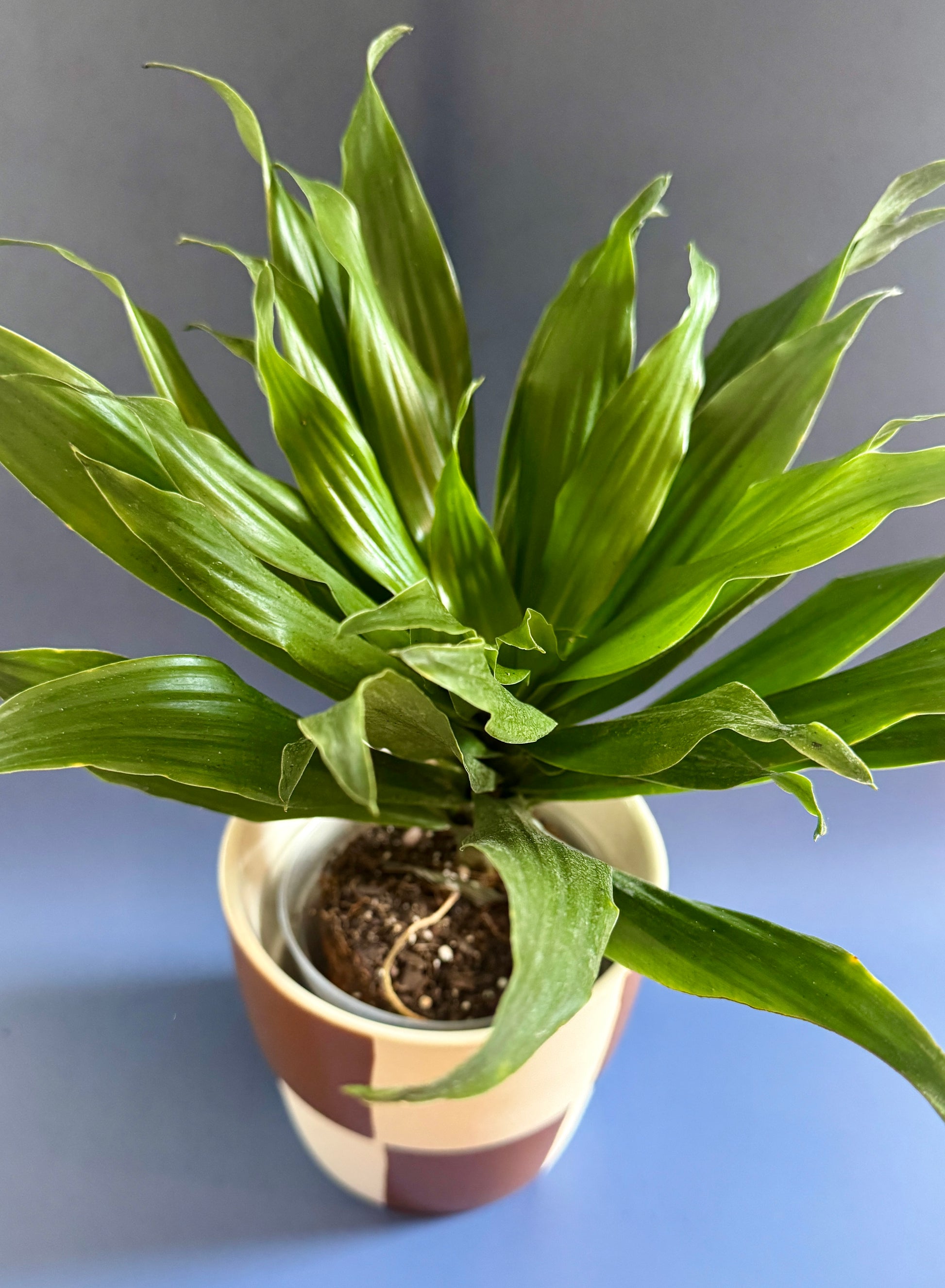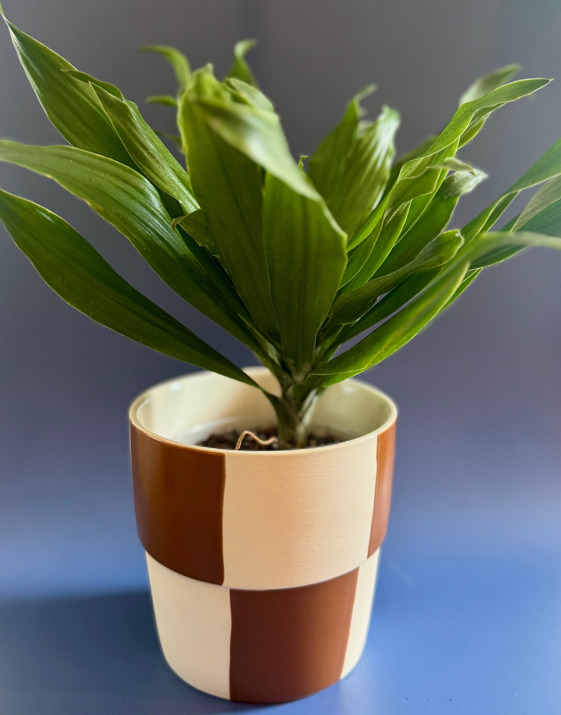 Elevate your space with this bold yet easygoing beauty. The Dracaena Janet Craig is a hardy, low-maintenance plant known for its lush, deep green foliage and air-purifying benefits. Paired with a modern two-tone checkered ceramic pot in earthy terracotta and cream, this combo brings fresh energy and playful contrast to any room.
