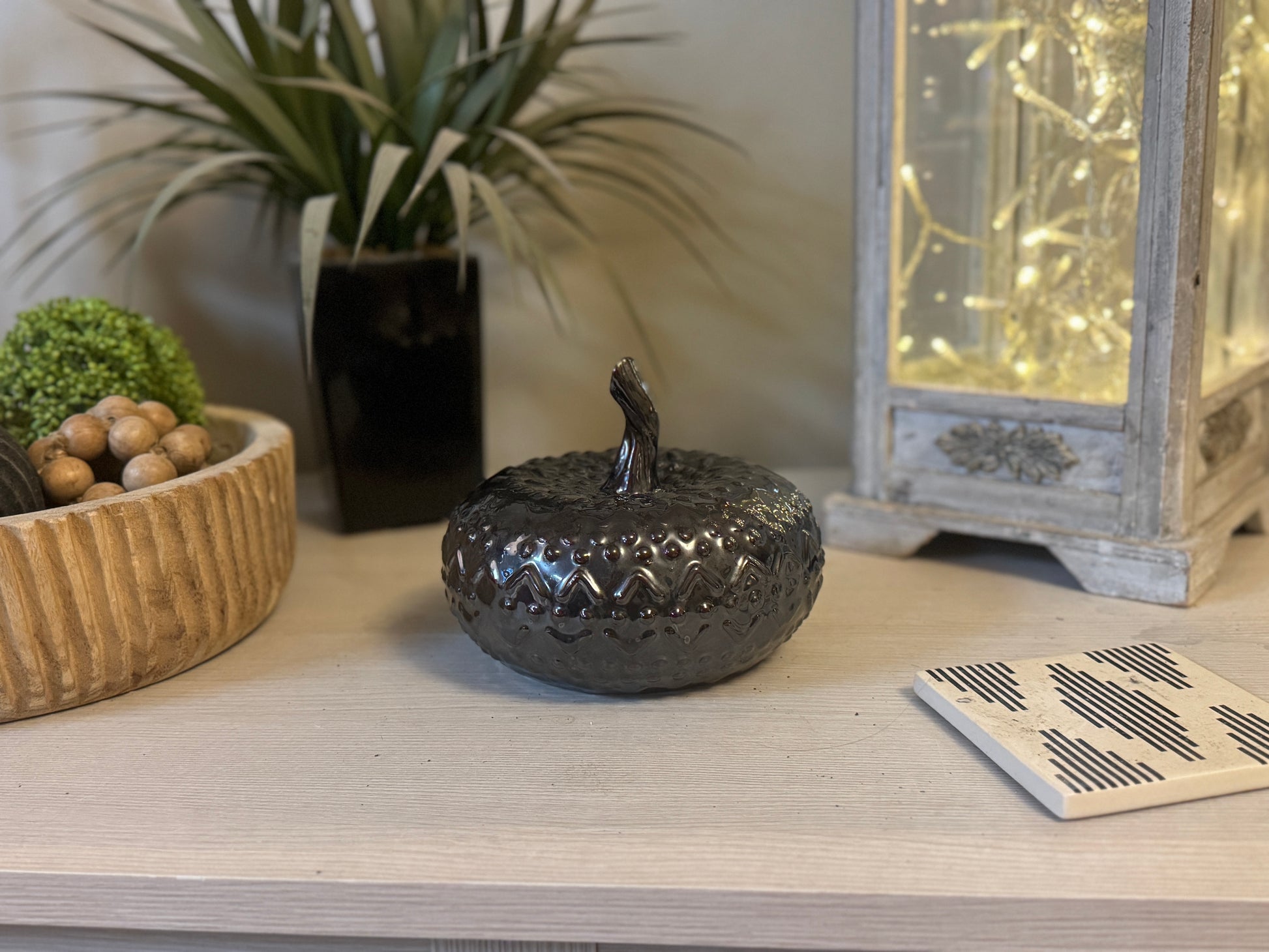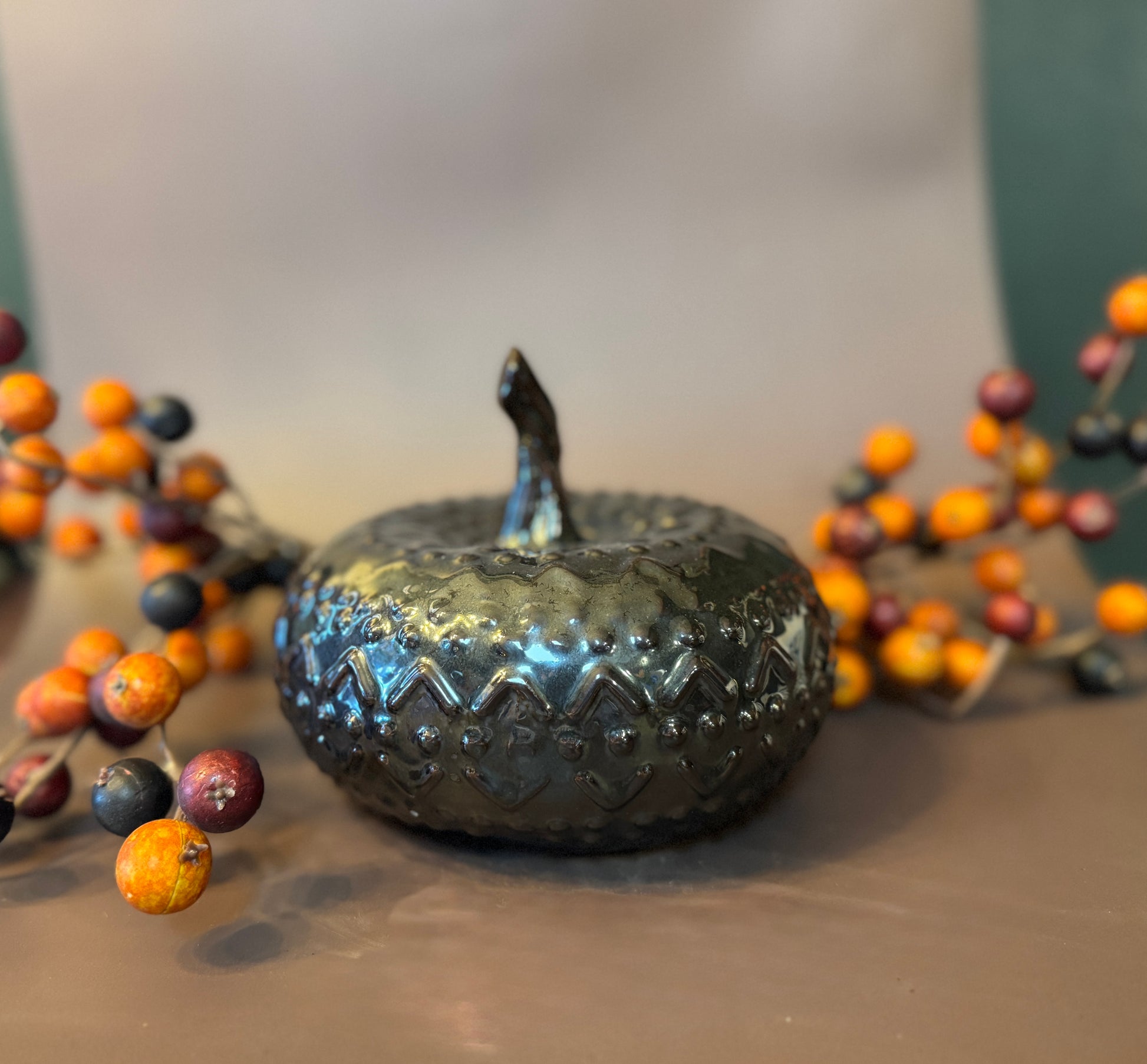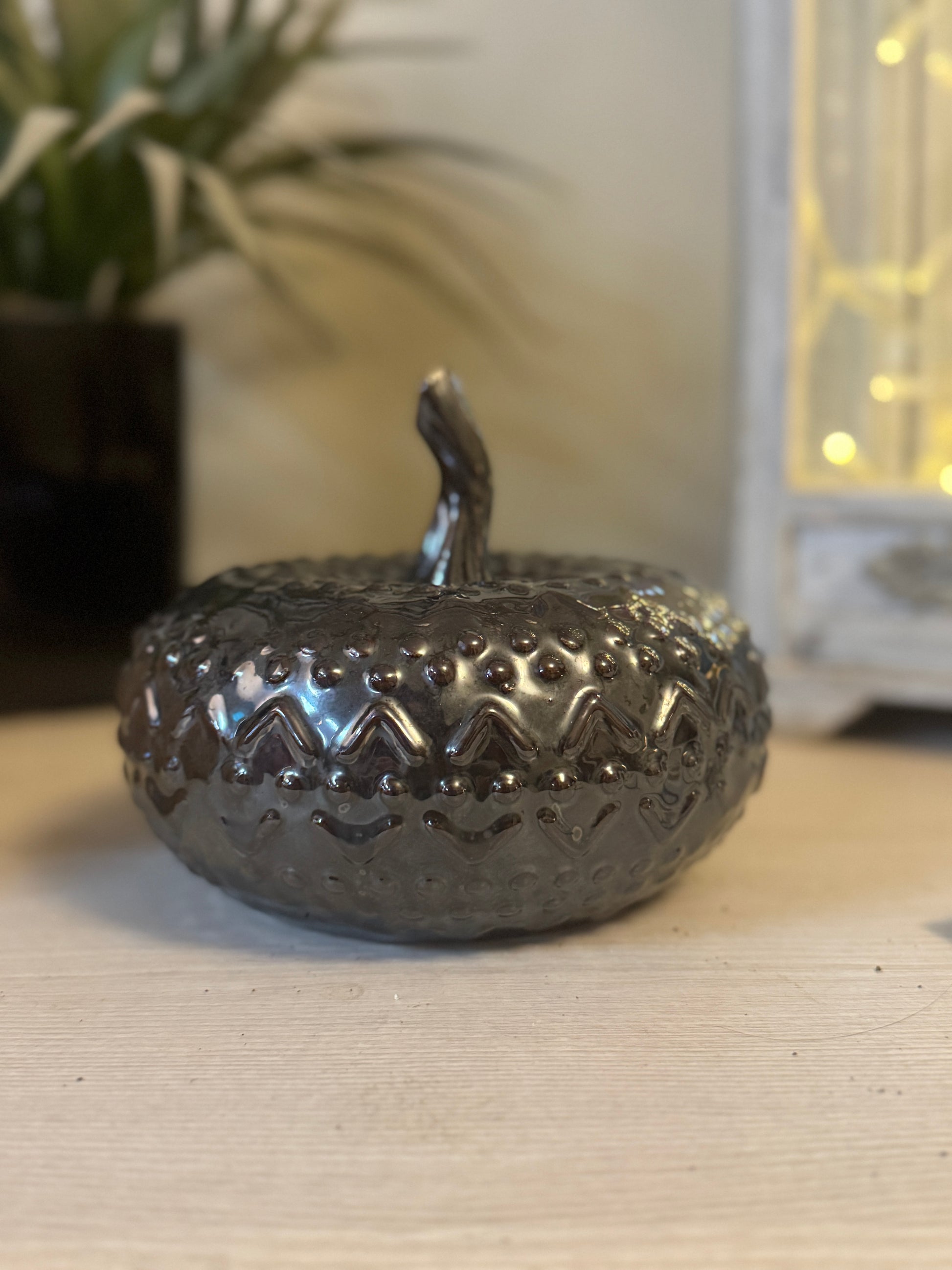 Eerie pumpkin with a metallic glaze. Layer in with your real pumpkins for a modern take on decor.