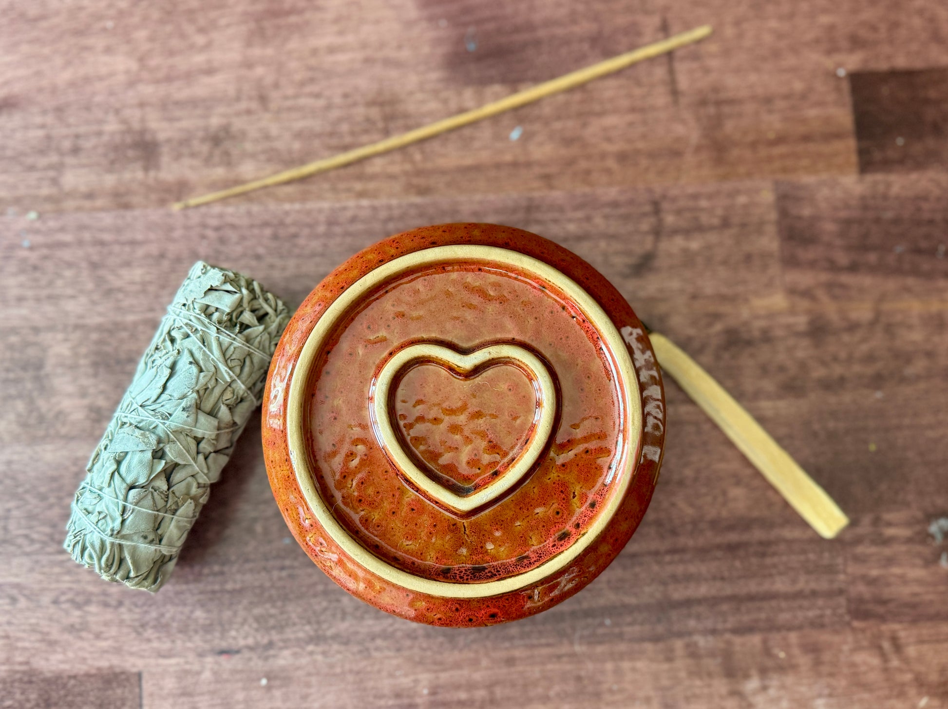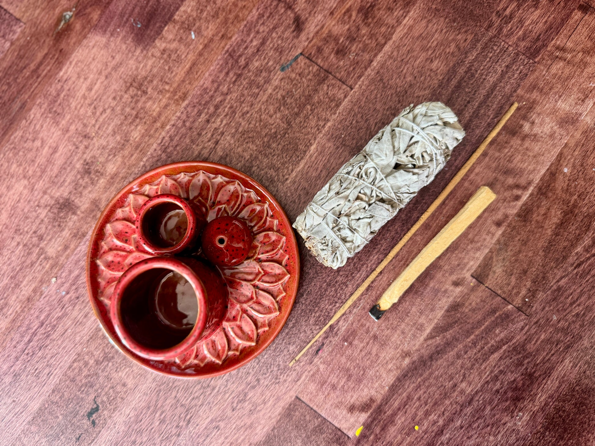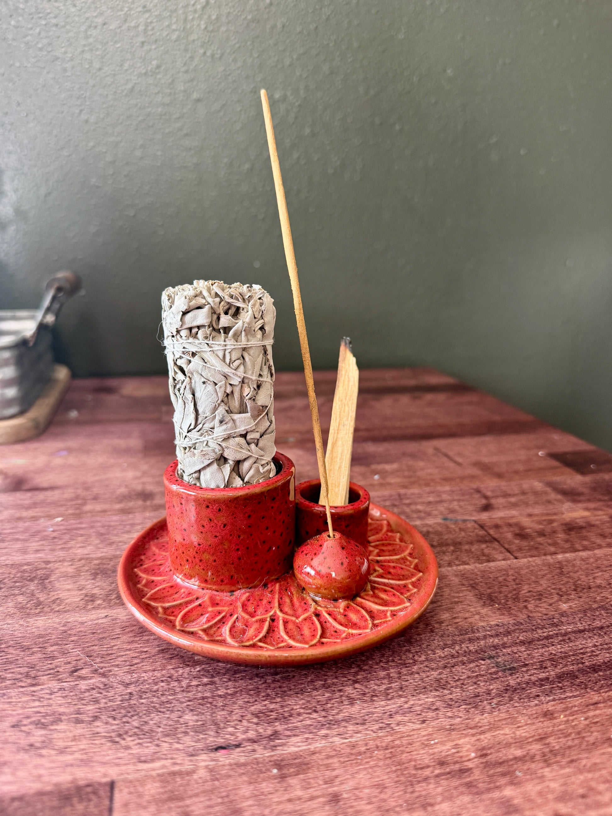 Rooted in rustic charm, this handcrafted red-hued incense holder brings earthy elegance to your space. With three versatile compartments, it’s designed to hold sage bundles, incense sticks, and palo santo — perfect for your cleansing rituals or cozy moments. The intricate floral etching adds a soft, natural touch, while the rich, speckled glaze gives it a timeless finish. Whether you’re setting the vibe or clearing the energy, this piece grounds your practice in beauty and function.