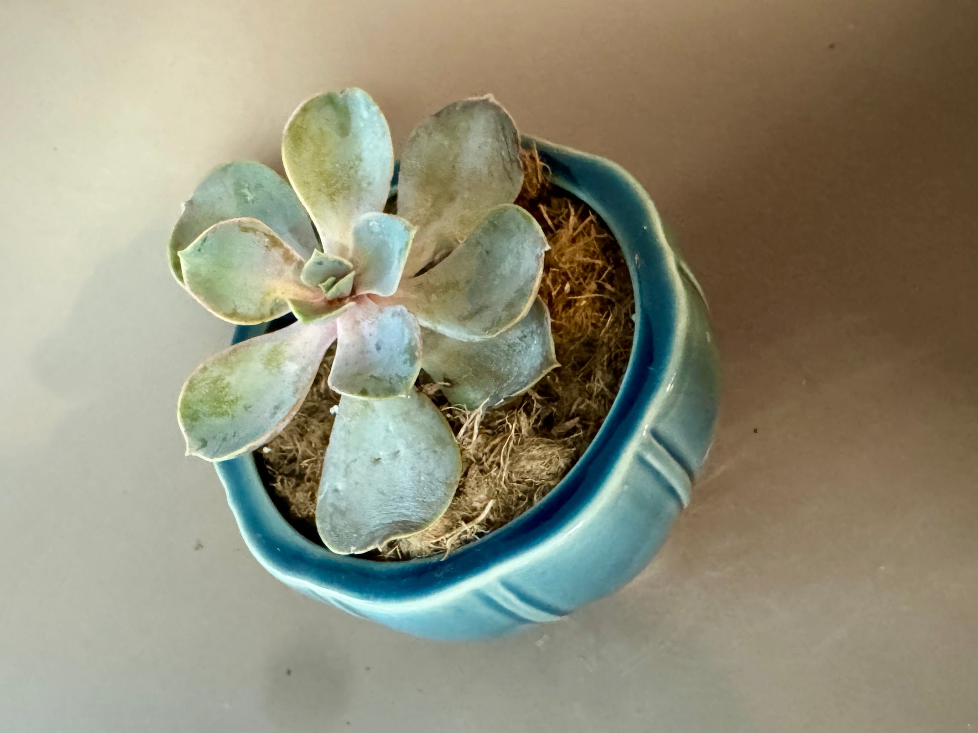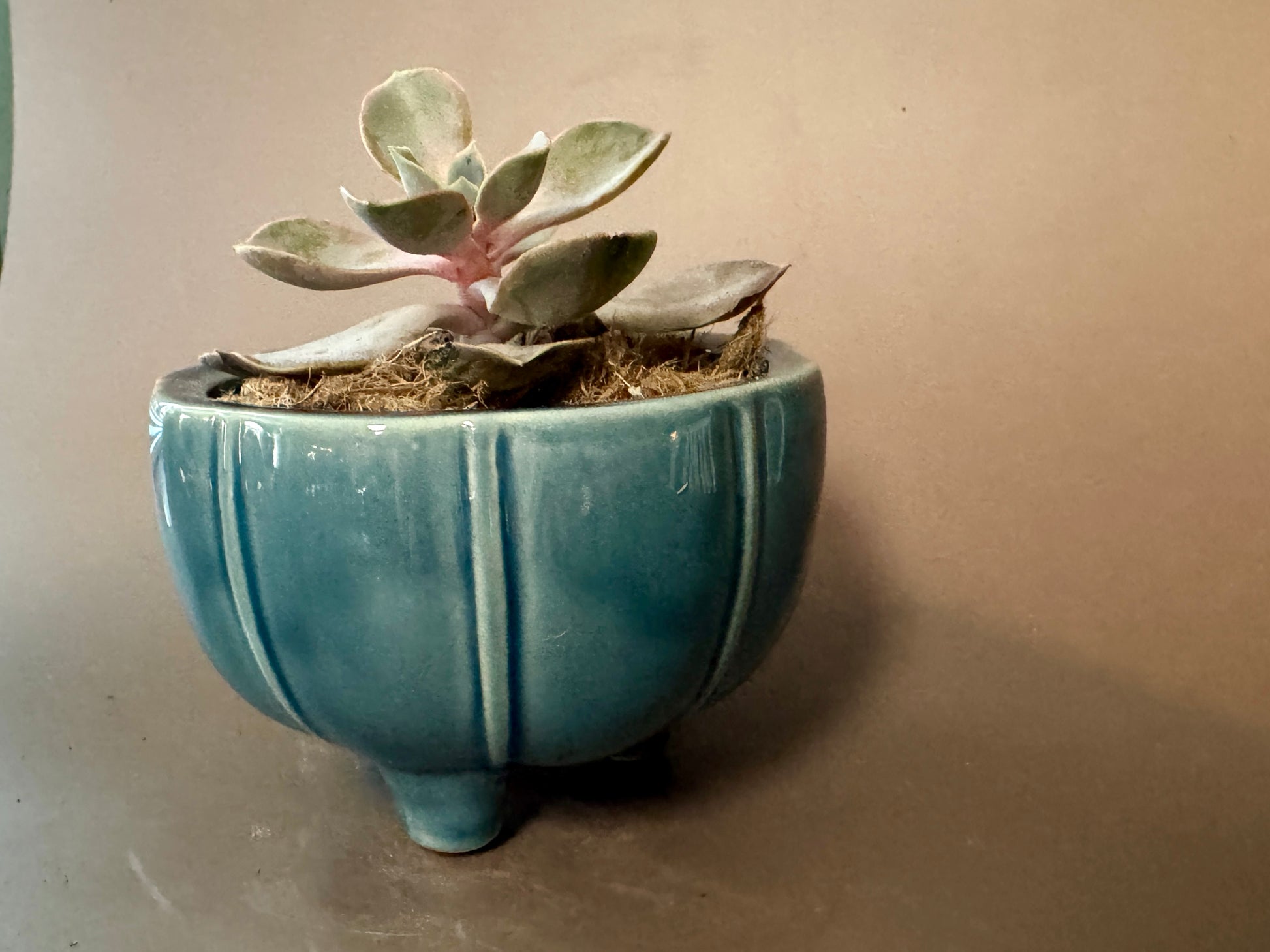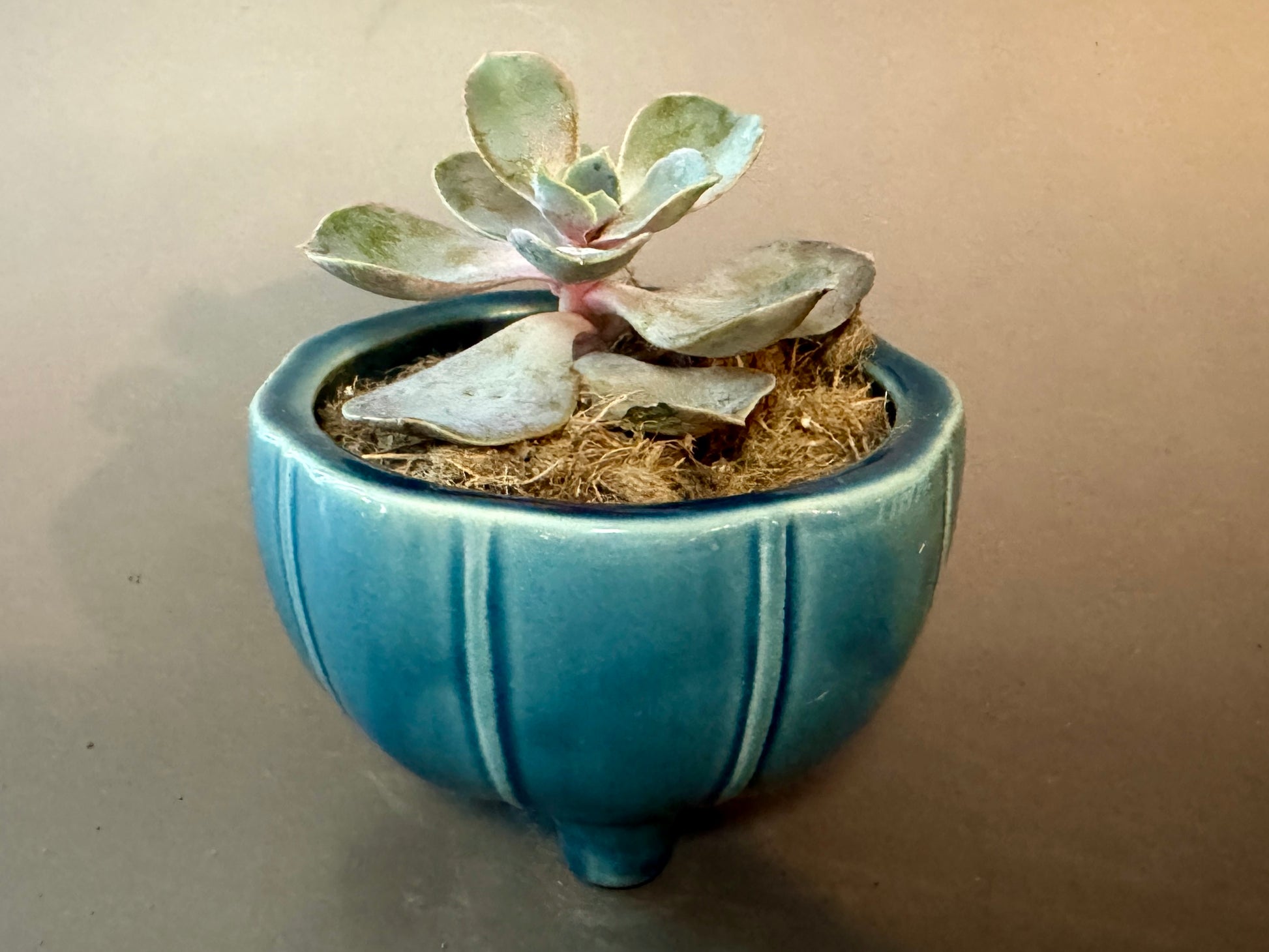 Add a cool touch of charm to your space with this frosty blue-green Echeveria nestled in a soft aqua ceramic footed planter. The succulent’s velvety leaves and rosette shape make it a subtle standout for any shelf, desk, or windowsill.