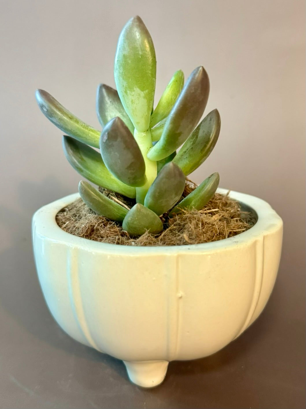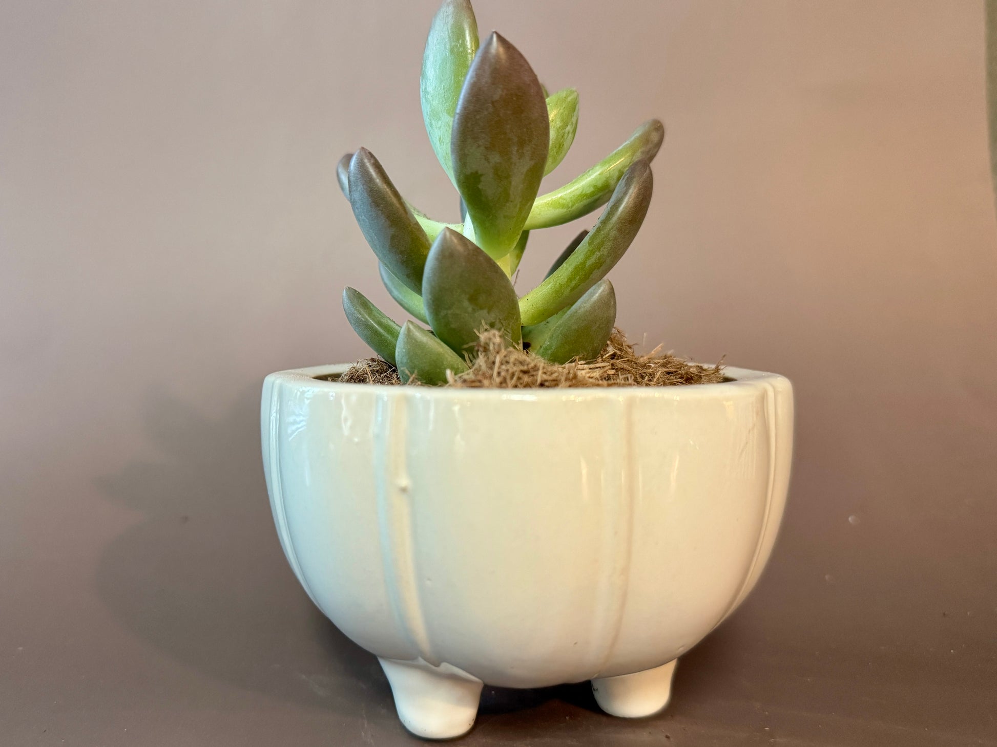 Soft, sculptural, and easygoing—this minimalist white ceramic pot stands on three rounded feet, offering a clean and modern touch to any space. Inside is a low-maintenance succulent with plump, pastel-toned leaves that add a fresh pop of green. This petite piece is perfect for desktops, shelves, or windowsills needing a subtle natural accent.