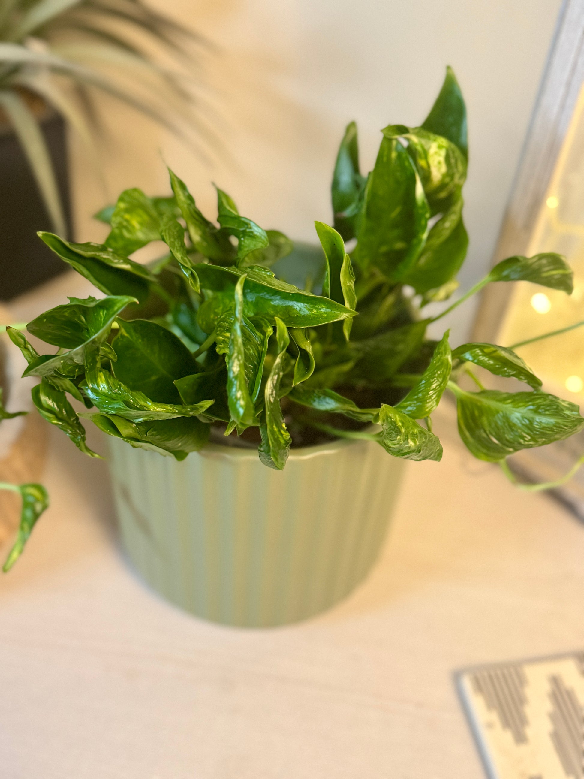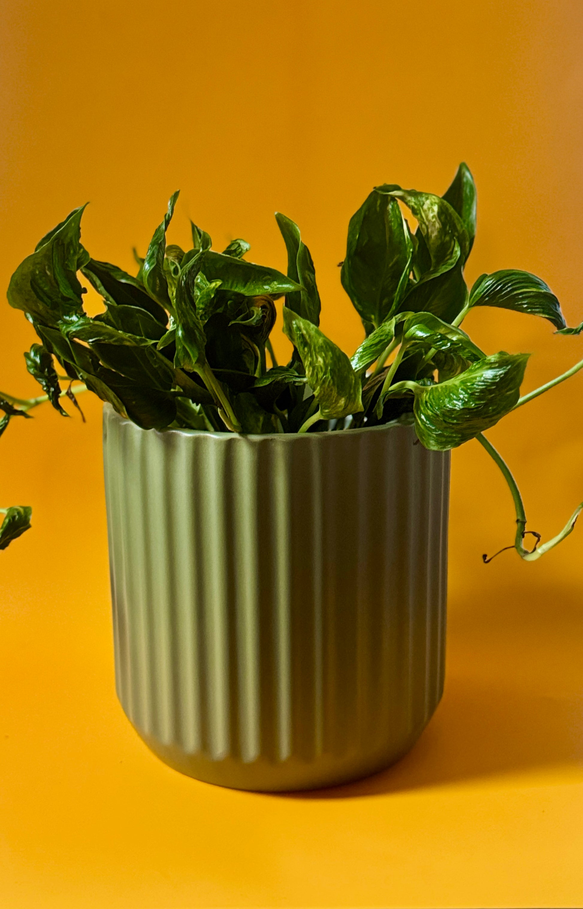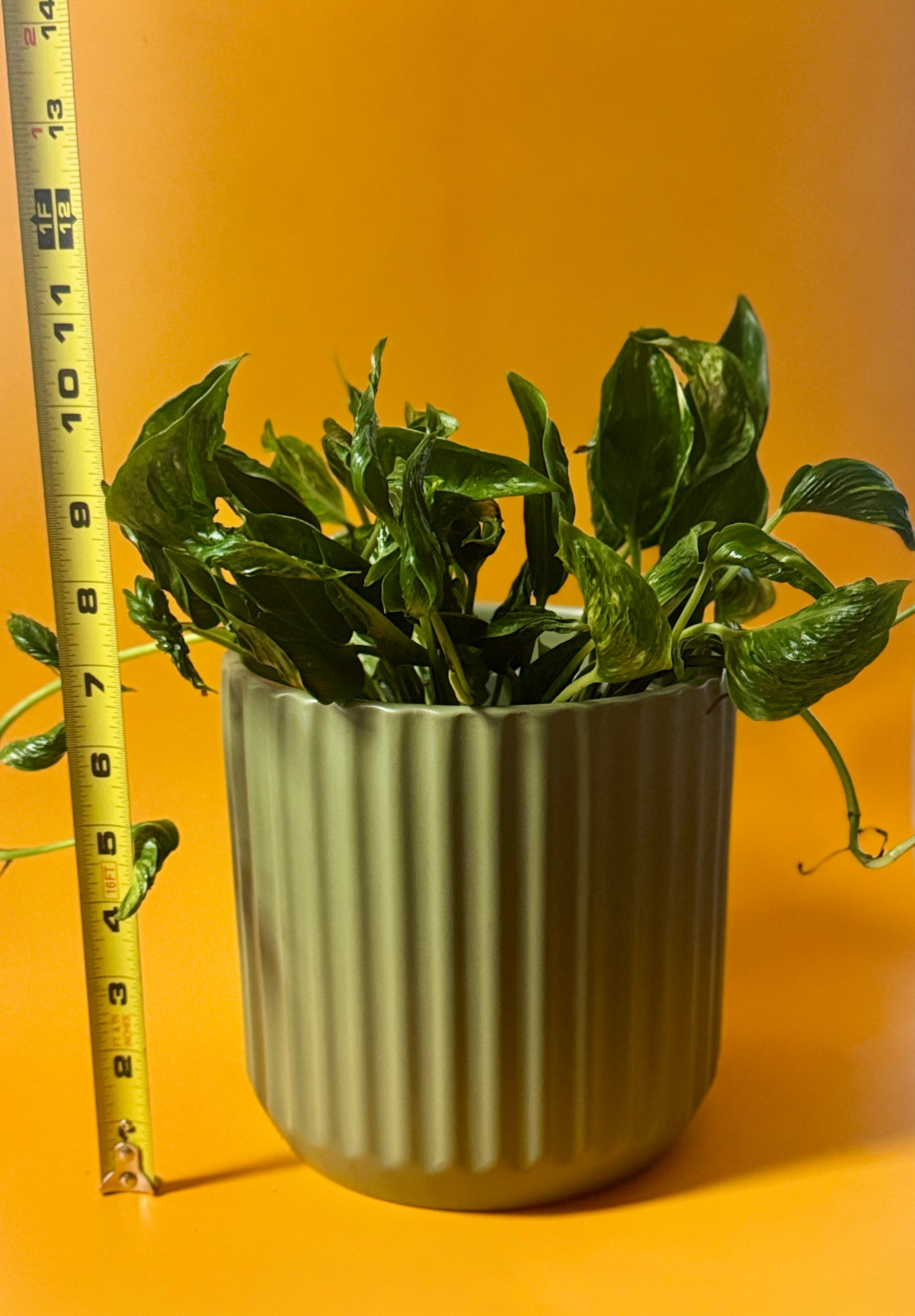 Add bold texture and wild charm to your space with this twisty-leaved Shangri-La Pothos, nestled in a beautiful green ridged planter. Known for its crinkled, curling leaves and low-maintenance care, this unique pothos variety brings character and vibrant greenery to any room.