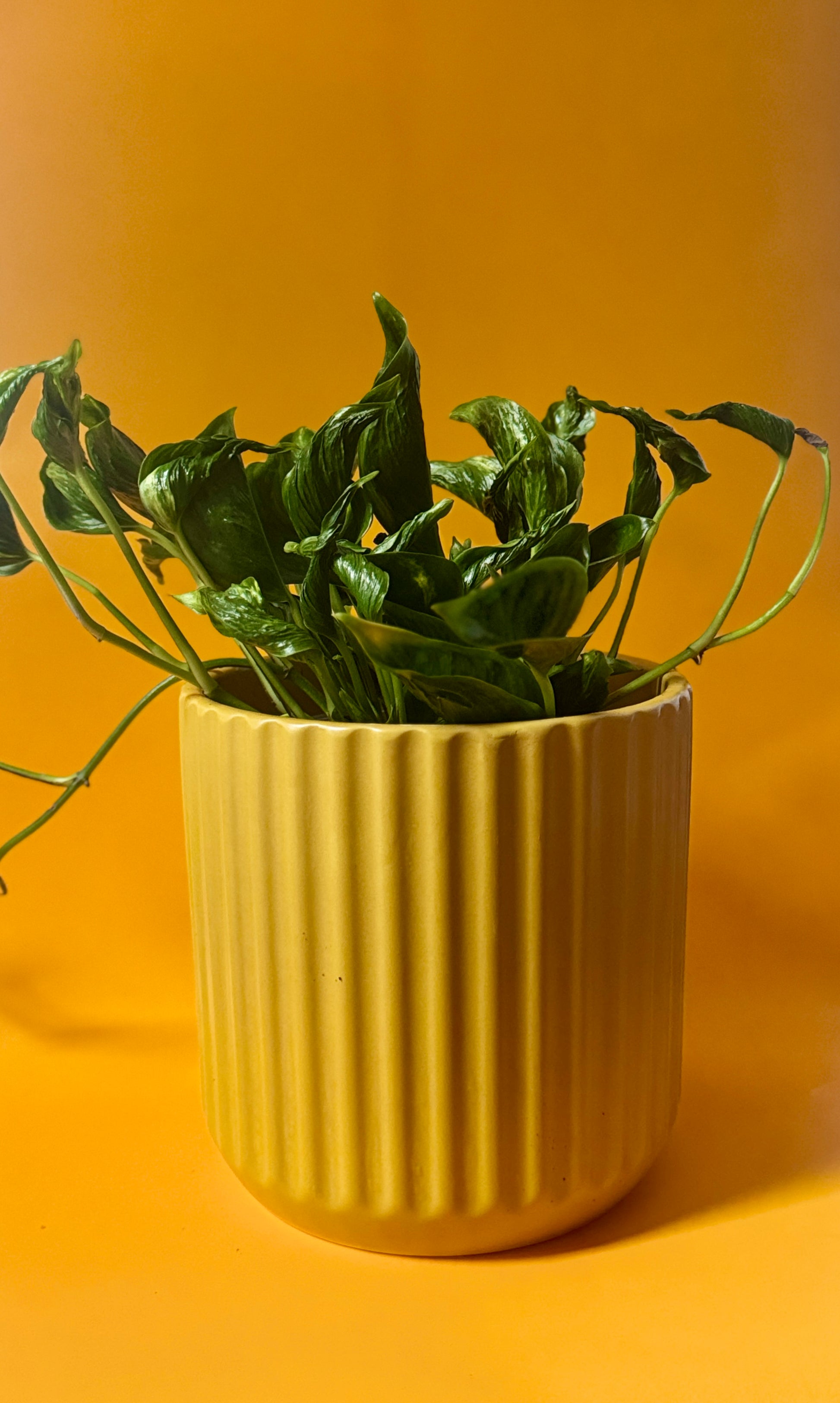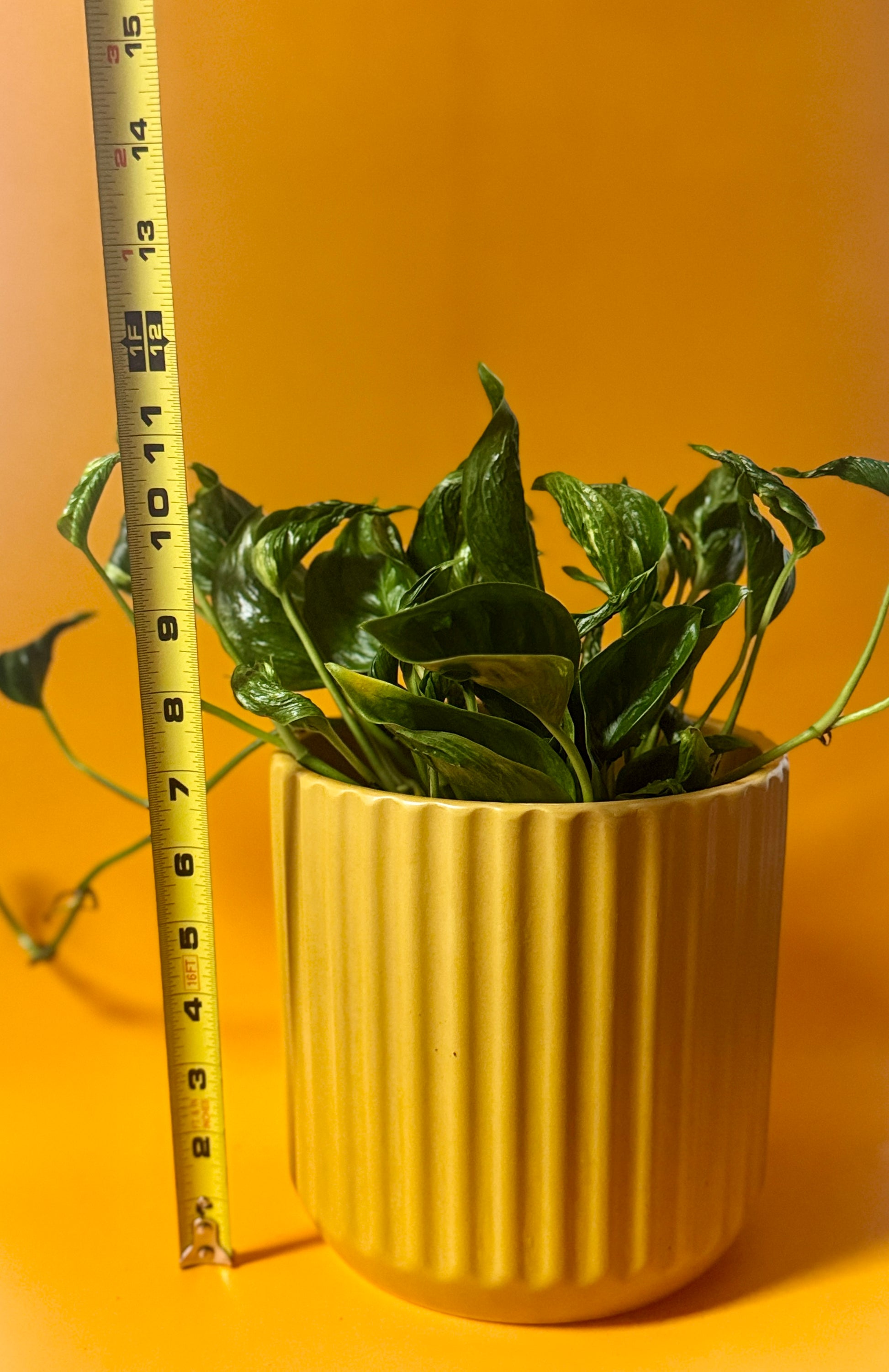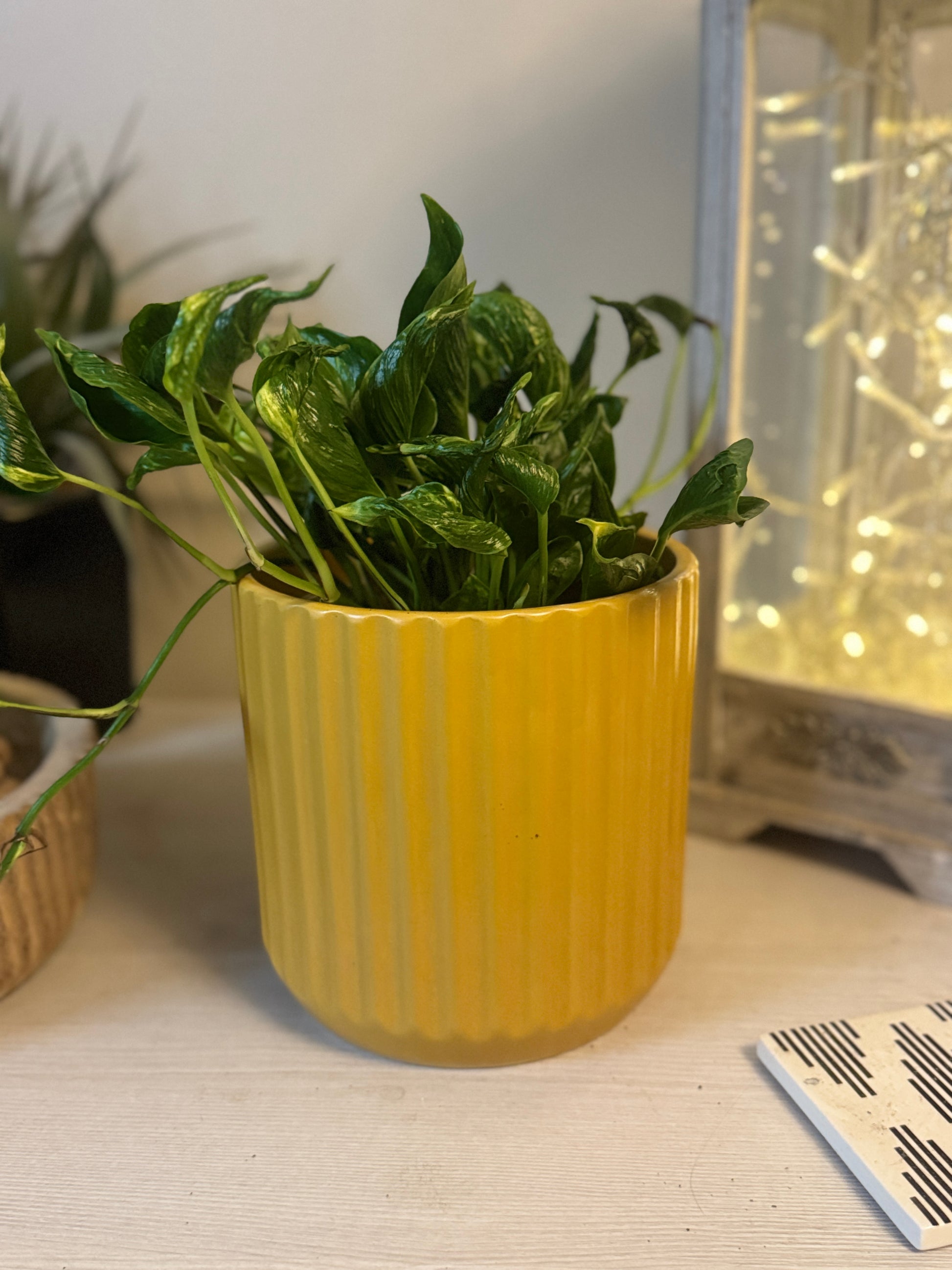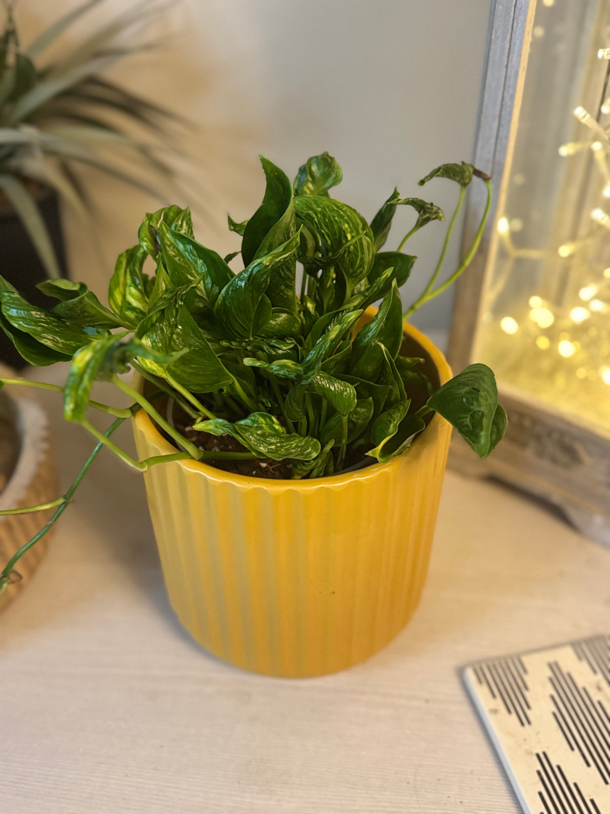A unique pothos with crinkled, twisted leaves that give it a lush, exotic look. Prefers bright, indirect light but can adapt to low light. Water when the top inch of soil is dry. Easy to care for and adds bold texture to any space. Comes in a yellow ridged pot.
