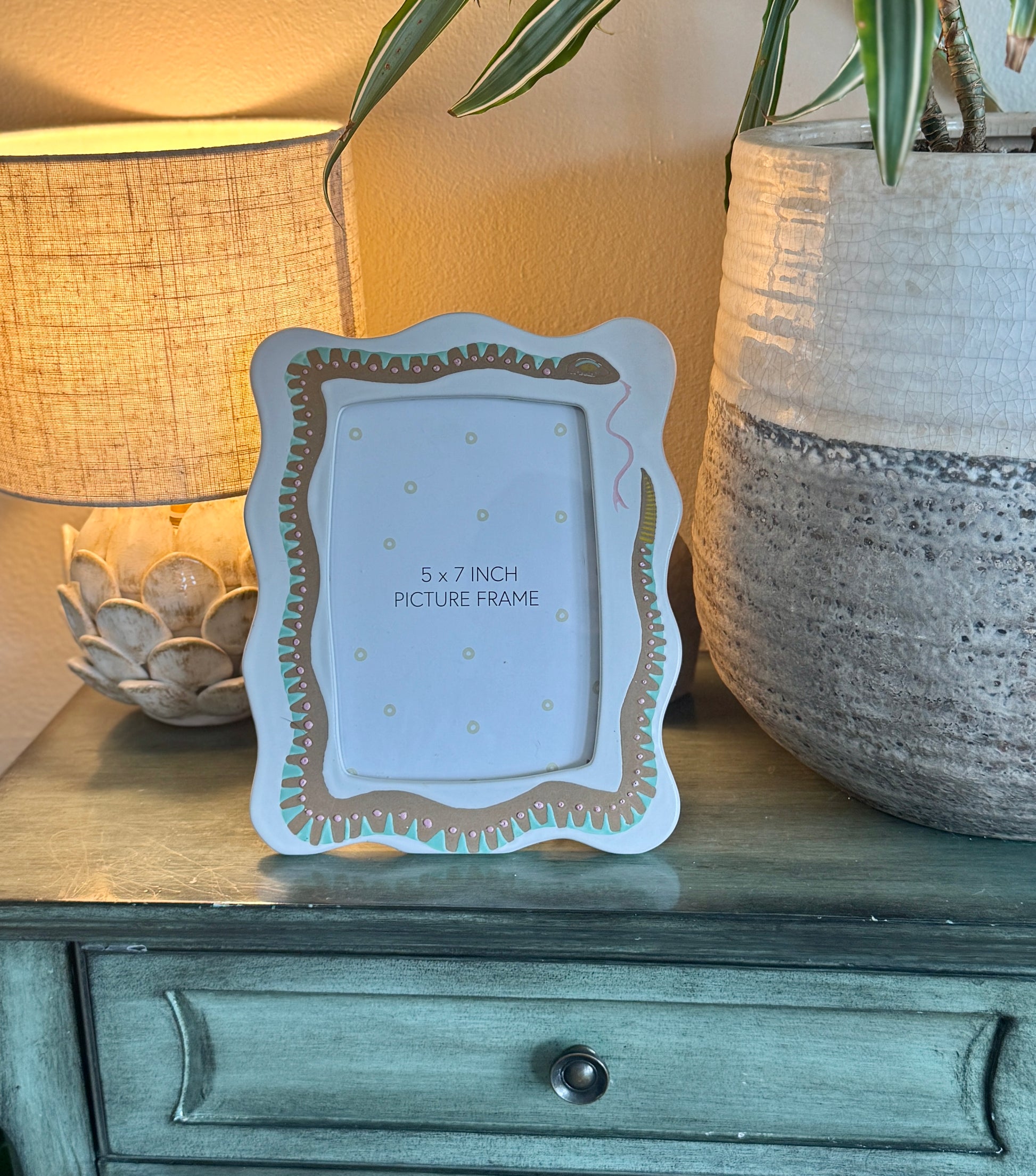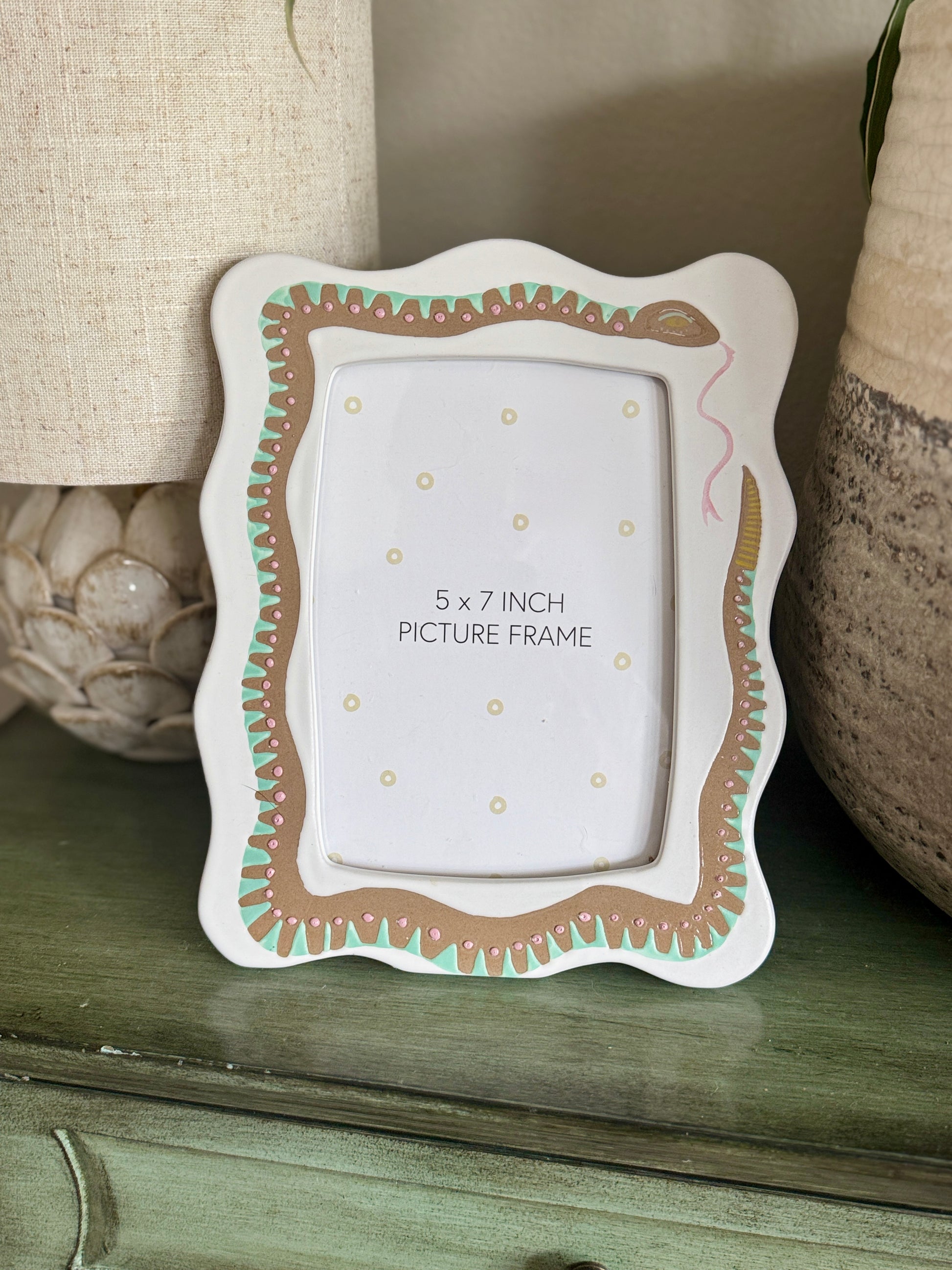 Bring a touch of whimsy and edge to your space with the Slither Frame. Hand-painted with a winding snake design in earthy tones of brown, green, and blush, this wavy ceramic frame turns any 5x7 photo into a striking statement piece. Perfect for adding personality to a shelf, mantel, or gallery wall, it’s a unique blend of playful charm and artistic flair.