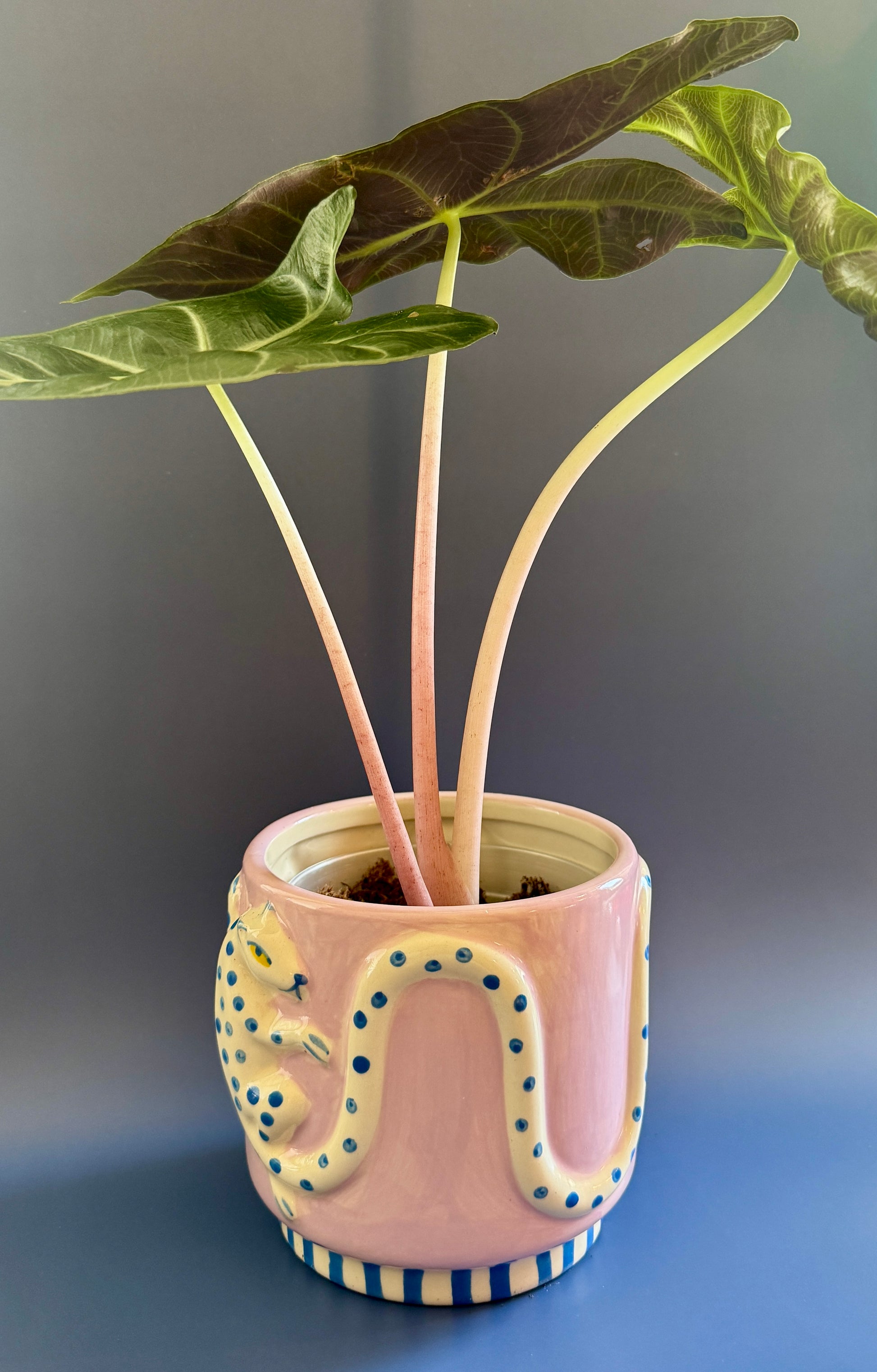 Wildly cute yet perfectly tame, this ceramic pot brings playful charm to any plant display. Featuring a dimensional leopard with a squiggly tail wrapped around the exterior, it pops with hand-painted watercolors.
