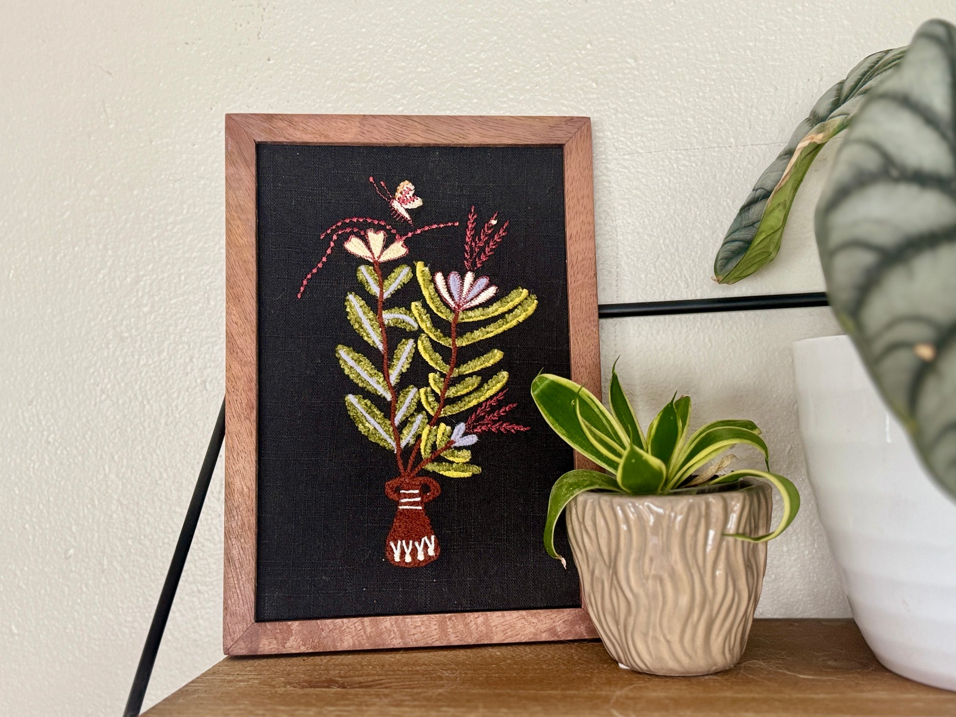 Add a touch of handcrafted charm to your walls with the Andalusia Wall Art. Featuring a richly embroidered floral design in warm earthy tones, this piece blends folk-inspired artistry with modern simplicity. The stitched vase and butterfly details stand out against a dark background, framed in natural wood for a timeless look. Perfect for cozy corners, gallery walls, or anywhere you’d like to invite a bit of nature indoors.